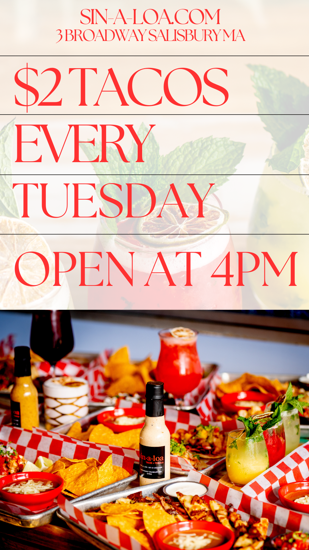 sin·a·loa Tacos and Tequila is a restaurant and bar with a fun beach atmosphere, offering Mexican-inspired food and drinks. Located on Salisbury beach, sin·a·loa is perfect for an end to a day at the beach, or a trip to Salisbury for food and drink!